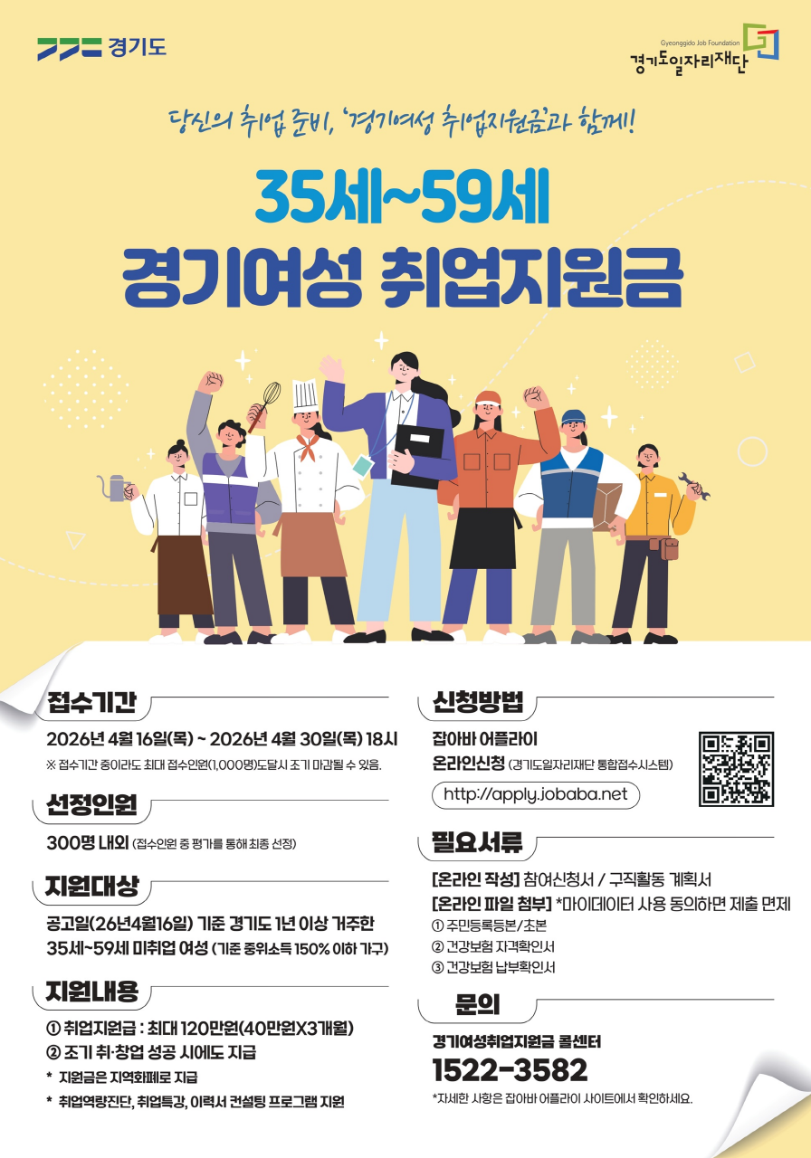 | 경기도, ‘경기여성 취업지원금’ 참여자 모집…35~59세 미취업 여성에 구직활동비 지원 (0) | 2026.04.17 |